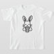 This simple black-and-white line art features a curious bunny holding a steaming cup of coffee. A clean and modern design for anyone who needs their caffeine fix and loves rabbits.