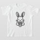 This simple black-and-white line art features a curious bunny holding a steaming cup of coffee. A clean and modern design for anyone who needs their caffeine fix and loves rabbits.