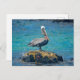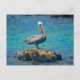 En pelikansk fågel står på en sten som tittar mat, medan en liten krabba klättrar uppför sten i vatten kring Galapagosön.