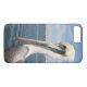 Stillahavs- pelikan för grå färg med blå himmel och vatten i bakgrunden.