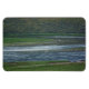 Ett foto av en flod i nationalparken Yellowstone, med flera grupper av kanadensiska gäss längs kustlinjen och några amerikanska pelikaner vilar i mitten vid floden på några exponerade platser. Bild Copyright ©Kimberly J Tilley.