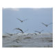 Ett foto av en flock med pelikaner som flyger över havet..