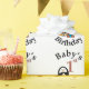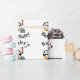 En fin svart och vit penguin sitter framför en cupkaka med ett ljus och en föreställning som är omsluten i ett plaid-omslag papper med en båge. Bild omges av ord "Baby 1:a födelsedag". Baby och födelsedagen är i svart och 1:a är i ett plasiat som innehåller röd, gult och blå på papper förpackning.