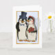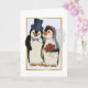 Det här söta pingvinparet är redo för sin bröllopsdag. Han ser elegant i sin tophatt och hon är söt i sin ro accenterad möhippa-slöja. Dam penguin har en söt bouquet röd ros. Matchande inuti designen.