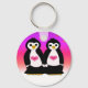 Ett sött pingvin par som håller händer. Rosa hjärtan på tummarna. En skuggad bakgrund av rosa och lila.