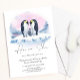 En vinter-temat Baby Gender Reveal bjudan. Julens helgdag har en penguinfamilj med en penguin chick som står på en is, med en elegant, vattenfärgad solnedgång i rosan. Den svarta typograftexten lyder: Vad kommer vår chick att bli?