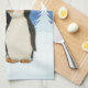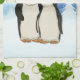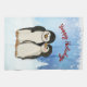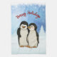 Det goda Penguin-paret på snö täckte mark med gräs träd och blå himmel i bakgrunden. Textkonstypografi ovanför säger Glad helg. Anpassa textområdet nedan eller ta bort om du inte vill det.