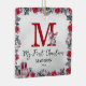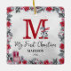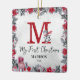 Cute baby monogram röda julklumpar med tvättat grått-bakgrund, elegant vattenfärgsfärgade blommigtar och blad, vidsträckta baby-penguiner, snögubbe, gåvor, julafton-nybörjare, barn, år, ordspråket "mina första julklappar" och namn.