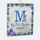 Cute baby monogram-jultomte med tvättat grått-bakgrund, elegant vattenfärg julafton blommigt & blad, vidsträckta baby-penguiner, snögubbe, gåvor, barn-nybörjare, namn, år, ordspråket "mina första julklappar" och baby.