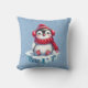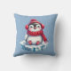 En söt vattenfärgad penguin sitta på ett isberg med röd halsduk, hatt och örlder med snöflingor.