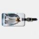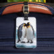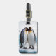Två penguiner står nära varandra på en liten isflod omgiven av isig vatten och avlägsna glaciärer. Textinformationen kan ändras.
