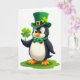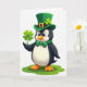 This card shows a chubby penguin standing in the center on a small patch of green grass, set against a plain white background that keeps all eyes on the character 💚. It wears a tall emerald leprechaun hat with a shamrock on the front and a band with a gold buckle, plus a matching green bow tie snug at its neck. The penguin’s big eyes and lightly blushed cheeks give it a tender, friendly look, like it’s posing for someone it really likes. In its left flipper, it holds a three-leaf clover with the word “Luck” printed across it in dark lettering, easy to read at a glance ☘️. The penguin’s feathers are deep black with soft highlights, and its belly is bright white, creating a gentle contrast that feels cozy and close. Its beak and webbed feet are a warm orange, adding a sunny pop of color near the bottom of the design. The grass beneath it curves in small waves and is dotted with tiny new leaves, with the penguin standing squarely above the green patch.
