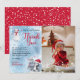 Cute water color penguin in in a Santa hat and snögubbe med snö som faller runt fotot "ONEderland Tack". Design är röd, grått, dammblå, svart och vit. Anpassa dig helt enkelt med ditt tack till dig. Baksidan har ett snöfall mönster över en röd bakgrund. Sammansatt av Helgdag hörnmönster.