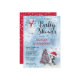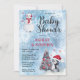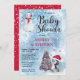 Tvättfärgspenguin i en tomathatt och snögubbe med snö som faller runt "Baby Shower". Design är röd, grått, dammblå, svart och vit. Anpassa helt enkelt dina duschdetaljer. Baksidan har ett snöfall mönster över en röd bakgrund. Sammansatt av Helgdag hörnmönster.