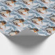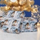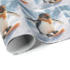 A penguin wearing goggles and an orange scarf is snowboarding down a snowy slope