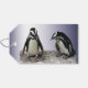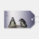 Det här paketet med märkre med gåvor innehåller två adsible African Penguins som står på en klippig gåva. De är vattenlevande, färglösa fåglar vars vingar har blivit flippor. Var och en har svarta rand och svarta fläckar på bröstet. Mönster på fläckar är unikt för varje penguin, precis som mänskliga fingeravtryck. De har rosa körtlar ovanför öga och rosa och svart fötter. Bilden upprepas på baksidan.