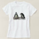 Den här T-skjortan har två adaterande afrikanska Penguiner som står på en bergsskjorta. De är vattenlevande, färglösa fåglar vars vingar har blivit flippor. Var och en har svarta rand och svarta fläckar på bröstet. Mönster på fläckar är unikt för varje penguin, precis som mänskliga fingeravtryck. De har rosa körtlar ovanför öga och rosa och svart fötter.