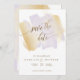 Elegant bröllop Spara datumkortet med vackra penseldrag i en harmonisk blandning av nyanser för lila och guldfärgad gult med frasen "Spara datum" i en snygg, modern, handskriven kalligrafi. Det tvättar att dra tillbaka penseldragen. Modern, elegantens minimalistiska stil. Observera: typografi är inte i verklig folie utan tryckt i en gyllene nyans. En del av vår insamling "Lila and Guld Brush Strokes Bröllop" med en mängd olika samordningsprodukter tillgängliga.