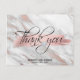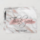 Säg tack till dina gäster med dessa vackra, vänliga, unika vykort. Faux ro guld penseldrag med ett vackert skript tack för ordalydelsen. Bakgrund i lätt grått marmor med ro guld folie. Anpassa dem genom att lägga till brid- och triomens namn och bröllop eller årsdatum med foto/bild. Kortets baksida innehåller ett foto med valfritt meddelande