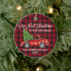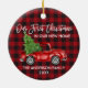 Modern penselskript Vår första jul i vårt nya hemornament inkluderar Watercolor Vintage Red Lastbil med Julgran. Red Buffalo Play.