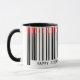 Röd laser på streckkod för lycklig pension med personlig namn. Namn kan ändras eller tas bort.