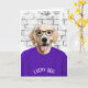 Hund i lila t-shirt och svartklädda glasögon på tegelväggens bakgrund för grattisar i pension.