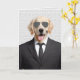 Golden hämmande hund i svarta affärer, kostym och flygande solglasögon på tegelväggens bakgrund för grattisar i pension.