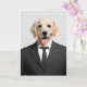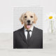 Hund i svarta företag kostym på tegelväggens bakgrund för grattisar i pension.