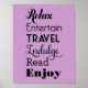 Pension-presentväggskonsten poster utskriftsdesignfunktioner ord som stavar RETIRE i snyggtens svarta text: "Slappna av, Underhållning, Resa, Indulge, Read, Enjoy" med "Wishing you a very lycklig pension" text. Använda funktionen "anpassa" för att ändra ljusets lila/violett bakgrund färg.