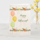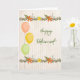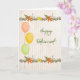 Skämt pension-kort med ballonger och blommor på en beige bakgrund. Blommorna är orange och gult och ballongen är rosa, gult och grönt. Tack vare Design Cuts och Hungryjpeg för en del av inslag i designen.