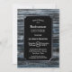 En rustik silver-kantad blått och grått-lada-pension-inbjudan med den vita texten markerad på svart bakgrund.