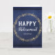Vackra och eleganta teckensnitt säger "Lycka till på pensionen!". Inuti kortet finns justerbar text med ett lyckönskande meddelande. Blå bakgrund med enkel falsk guldbladskrans.