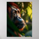 En häpnadsväckande illustration av en orangutan som gazar genom lush-regnskogspapper, badad i gyllene ljus. Perfekt för djurentusiaster, älskare och exotiska djurkonssamlare.