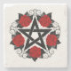 Svart pentagram med mönster, dekorerad med blomning, röd ros med löv på vit bakgrund. Tatto stil.
