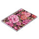 A vibrant array of pink and orange peonies is artfully arranged against a dark background, creating an eye-catching and colorful floral pattern. The detailed blossoms are interspersed with rich green leaves, enhancing the lush appearance.