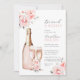 Fint känslig inbjudningskort för möhippa BRUNCH & BUBBLY. Bouquet på rosa vattenfärgspennor, päronblommor med grönt. Champagne flaska flute-glasögon. Brid med blonda hår i vit klänning. Perfekt inbjudan för alla party-duschteman; sommar, vår eller när som helst på året. Lätt redigerbara mallkort. färg, text, teckensnitt kan ändras.