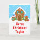 Det här roliga och festliga julkortet kan personifieras med ett namn eller en titel, till exempel son, sonson, systerson, vän osv. Det har ett sött hus av pepparkakor dekorerat med röda och gröna godisar. Bredvid huset finns söta pepparkaksgubbar med presenter, iklädda tomteluvor och en scarf. I bakgrunden syns en klarblå vinterhimmel med eleganta fallande snöflingor. Texten kombinerar dekorativa och sans serif-teckensnitt för en stilren och modern look. Detta är perfekt för en pepparkakshus-dekorationsfest på julen.