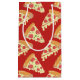 Dessa små presentpåsar i roligten har en upprepad mönster av skivorna med pepperoni pizzabydroppar med ost.