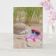 Vänder-, solglasögon och sommarhatt på stranden för att få en väns födelsedag.