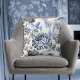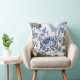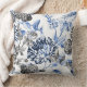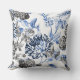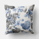 En vintage botanisk blommigt dekorativ kudde med svarta och vita blommigtar ovanpå blå och vit blommigt.