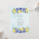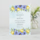 This watercolor design features bright yellow lemons nestled among periwinkle blue anemones and lush green foliage. The soft sky blue wash background creates a serene and fresh atmosphere for a Mediterranean-inspired summer event. Delicate botanical illustrations decorate the design with a vibrant, nature-inspired palette.