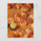 Ett vykort för konst i bra med den imponerande målningen Peacher (1883) från Claude Monet (1840-1926). En livsstilsbild av färska mogna persikor mot orangens bakgrund.