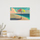 AI genererade korall- och tealstrande konstverk med paraply och berg.