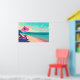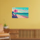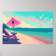 AI genererade korall- och tealstrande konstverk med paraply, stol och berg.