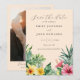 Detta moderna eleganta persika akvarell tropiska blommor och grönska foto bröllop spara-datum kort kan anpassas med din information i modern typografi och ett speciellt foto på baksidan. Designad av Thisisnotme©