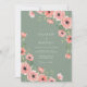 En delikat kaskad av persikoblommor och anemonliknande blommor inramar denna design, mot en dämpad salviafärgad bakgrund. Den måleriska akvarelleffekten ger scenen en romantisk mjukhet och en luftig, eterisk kvalitet.