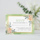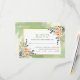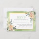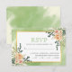 Persika vattenfärgsblommor och löv gröntar blommigt boho bröllop OSA card. Den här eleganten visar ett guld ram och persikofärgade blommor med sukulent och eukalyptus löv på den övre högerna och grund lämnat hörn och texten i sage grönt och svart. Bakom ram finns en grönt med vattenfärg stänk.