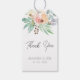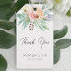 Mjuka persikofärgade vattenfärgblommor med grönska skapar en varm romantisk look som fungerar bra för vårbröllop, trädgårdsceremonier och utomhusmottagningar. Anpassa namnen och datumet för att skapa anpassade tack-kort för bröllopsgåvor, välkomstpaket eller gästpresenter.