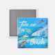 Delfiner i surfan, havssköldpadda under vatten och människor som leker på stranden, idylliska havsbottenmålning med "ta mig till stranden" i modern typografi.