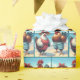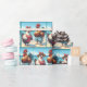 A tupp och en höna som är klädd på strandbadsstället på en sandstrand med blå hav vinkarare i bakgrunden